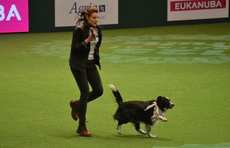 | Alena Smolíková s border collií Dapper Dame Black Chevers (Keysi) vyhrála jako první neanglický tým nejprestižnější soutěž v dogdancingu. |